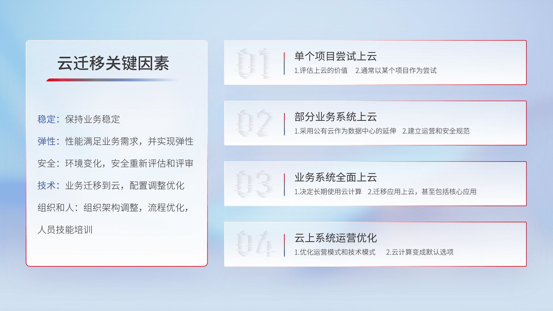 结合实际业务,,从规划设计、、云平台选型、、云原生改造、、数据迁移、、、集成交付,,,,迁移全过程为客户识别最佳上云路径,,做好风险识别管理,,,,设计网络架构、、、身份权限、、、安全审计合规、、、操作审计、、、、日志审计、、、监控告警策略、、多站点容灾设计等,,对云上基础设施进行整体规划,,提升IT治理水平,,,以满足弹性、、、、高可用、、、高性能的需求。。。
