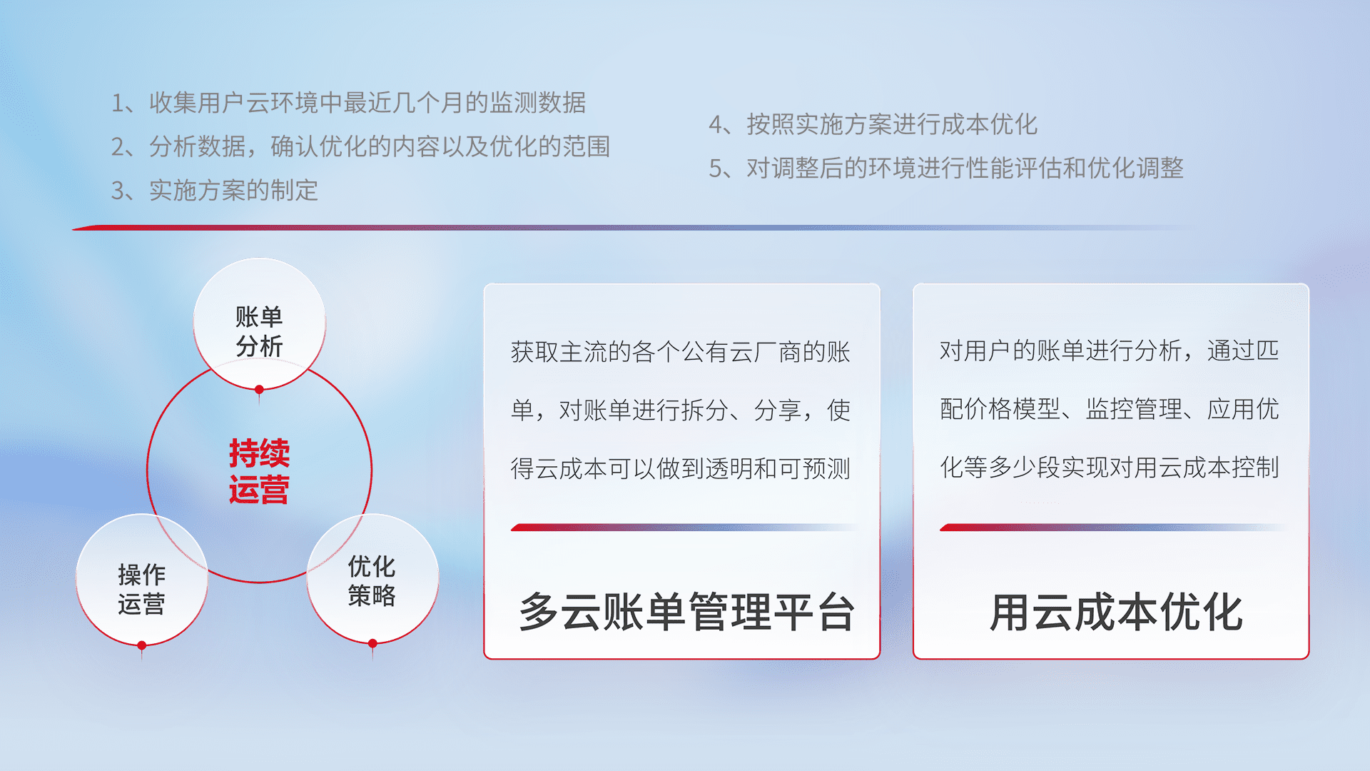 通过多云纳管,,,以统一的资源数据模型把客户的云资源进行抽象和封装,,进而实现对多云资源的统一操作,,保障云资源管理的可靠性、、稳定性与可用性。。量身定制化运维内容,,,配置、、、、开发运维、、、补丁管理、、、备份、、、监控、、、、认证和访问管理、、审计和日常巡检等,,,保障在用云过程中的可靠度,,,,稳定度以及高可用率。。。。